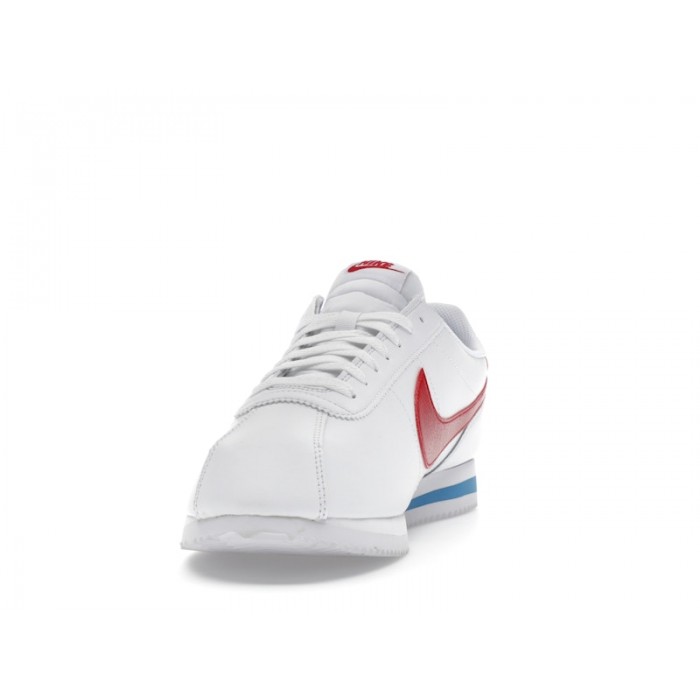 Цветовая гамма кроссовок точно воспроизводит культовую расцветку из фильма "Форрест Гамп". Основу составляет чистый белый цвет верха, дополненный яркими красными акцентами на фирменных логотипах Nike Swoosh по бокам, на язычке и заднике. Межподошва украшена синей вставкой, контрастирующей с белым основанием. Это сочетание создаёт мгновенно узнаваемый образ, ставший символом американской поп-культуры и легко интегрирующийся в различные повседневные стили.