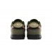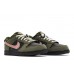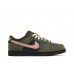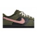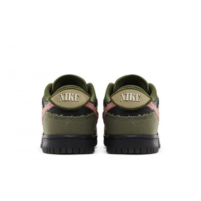 The Nike Dunk Low Dunks Not Dead is a low top casual athletic shoe featuring a pebbled leather upper in Black, overlaid by Medium Olive canvas with distressed edges. The Nike Swoosh in Pink Foam is attached to the outer sides by erratic visible stitching and via velcro on the interior. Nike branding appears on the tongue, rear heel, and included logo pin, along with a Dunks Not Dead branded pin.