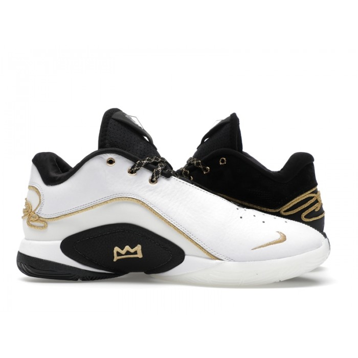 The Nike LeBron 22 Mogul arrives with a bold and regal design, combining white, black, and rich Metallic Gold to honor LeBron James’ legacy both on and off the court.This powerful Mogul Nike LeBron 22 silhouette features an asymmetric black and white design, which symbolizes LeBron’s ongoing push for equality. The mirrored shoes are paired with shimmering gold accents that reflect his championship pedigree. A crisp white synthetic leather upper is contrasted by black detailing and crowned with gold elements throughout, from the tongue to the midsole trim, to the golden rope signature on the heel. This Mogul colorway features forefoot and heel Zoom Air units along with saddle wings for enhanced midfoot stability. Underfoot is a yin-yang style outsole with a multidirectional traction pattern that adds grip.