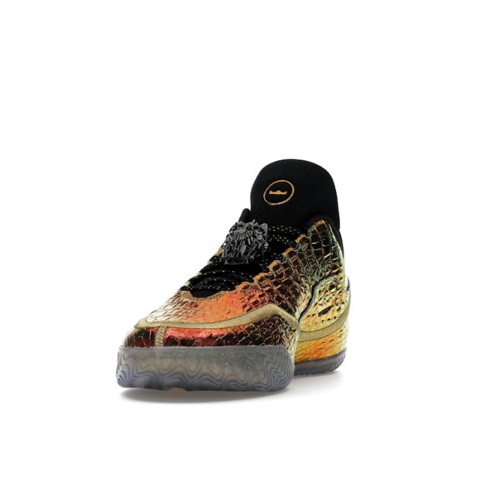 Цветовая гамма Warning Label приковывает внимание сложным градиентом, плавно переходящим от яркого желтого через оранжевый к насыщенному темно-красному оттенку. Этот визуальный эффект дополняется фирменным брендингом: на боковой стороне расположен металлический медальон в форме головы льва, символизирующий крадущуюся мощь LeBron. Черные элементы внутренней отделки и золотистая маркировка на язычке завершают премиальный образ модели.