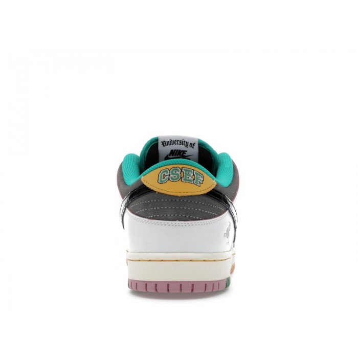 The Nike SB Dunk Low CSEF showcases an innovative partnership with the College Skateboarding Educational Foundation, combining skate culture with educational advocacy in a striking sneaker. Crafted from a premium medley of patent leather, suede, smooth leather, and mesh, the sneaker's eye-catching palette of summit white, black, iron grey, clear emerald, and bucktan creates a visually captivating experience. Hidden beneath the skate-friendly design, playful features such as a scantron-inspired tongue and a flaming graduation cap graphic bring its educational theme vividly to life.