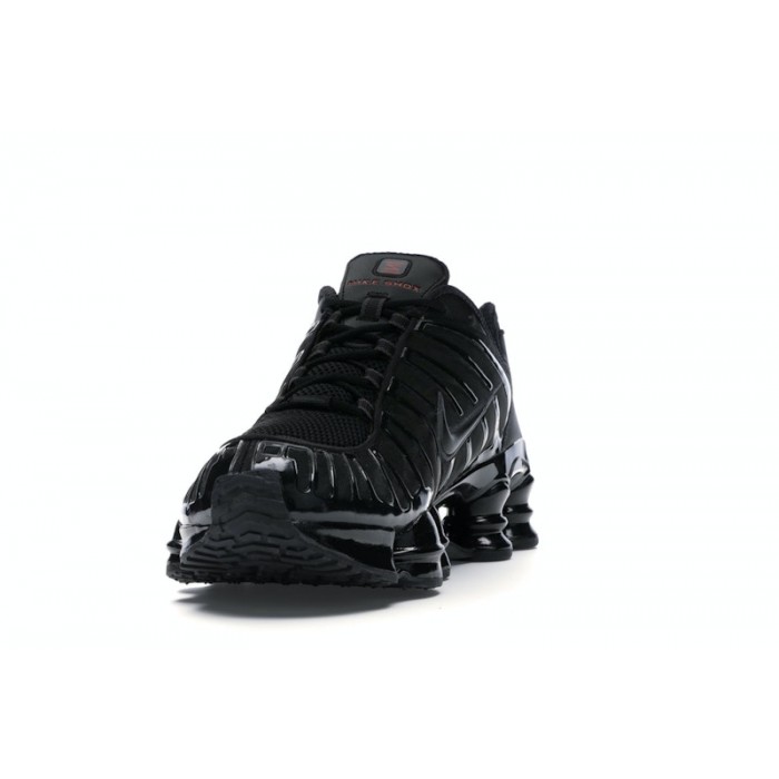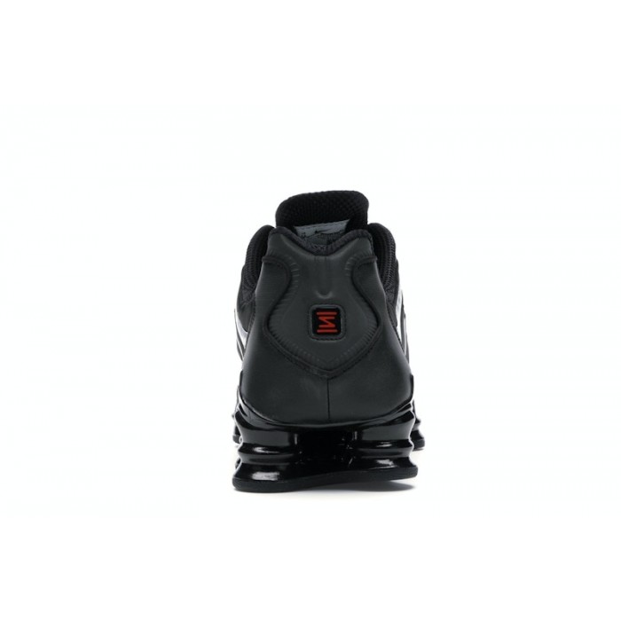 The Nike Shox TL Black Metallic Hematite features a combination of black, max orange, and metallic hematite color schemes.