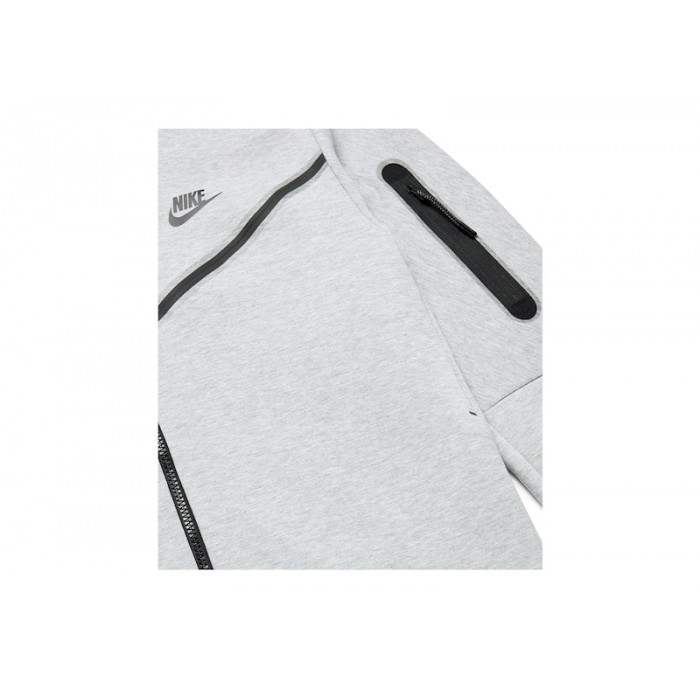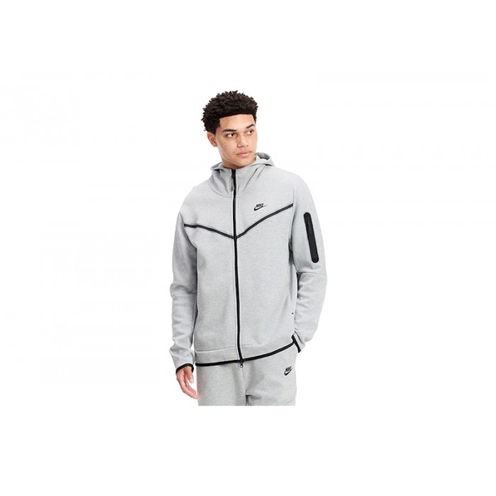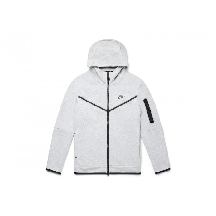 Nike Tech Fleece Full Zip Hoodie is heather grey in color with black accessories.