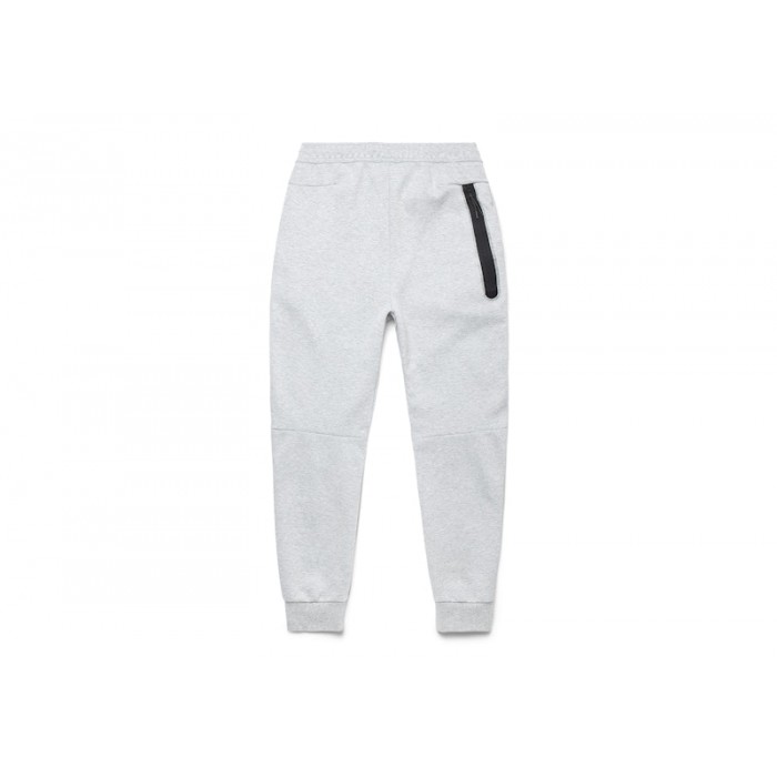 This Nike Tech Fleece jogger is a heavy, breathable 100% cotton fabric. It is all heather grey with a small and outstanding black Nike logo on the left thigh. It features a ribbed waistband with a black elasticated drawstring with loose ends. Two side pockets are available on both sides of the joggers. A more oversized side pocket on the left leg is enclosed with a black zipper. The legs are reinforced with ribbed knit cuffs. Not forgetting, there’s a company label with instructions on handling the jogger on the waist at the back.