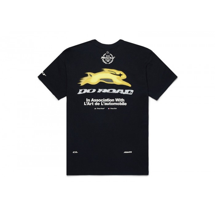 The Nike x NOCTA L'Art Burrow Tee Black is a black cotton t-shirt printed with a white Nike Swoosh symbol and NOCTA branding on the chest. L’Art and NOCTA branding appear on the sleeves in white. The back features a golden rabbit graphic with Do Road and In Association with L’Art de L’automobile white text below, along with three additional branding accents.