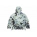The Off White/Night Silver Nike x NOCTA Opal Deep Cover GORE-TEX Jacket is made of GORE-TEX which is both waterproof and breathable. The jacket has a vibrant design, which is mostly different shades of Off White with black and blue in a sort of kaleidoscopic design across the front and back. A black Nike swoosh appears on the side of the chest, with a cargo pocket on each side of the zipper. The back has a single large pocket in the center. The jacket has an adjustable hood and a drawcord at the waist. It also comes with a detachable microfiber towel and a towel bag.