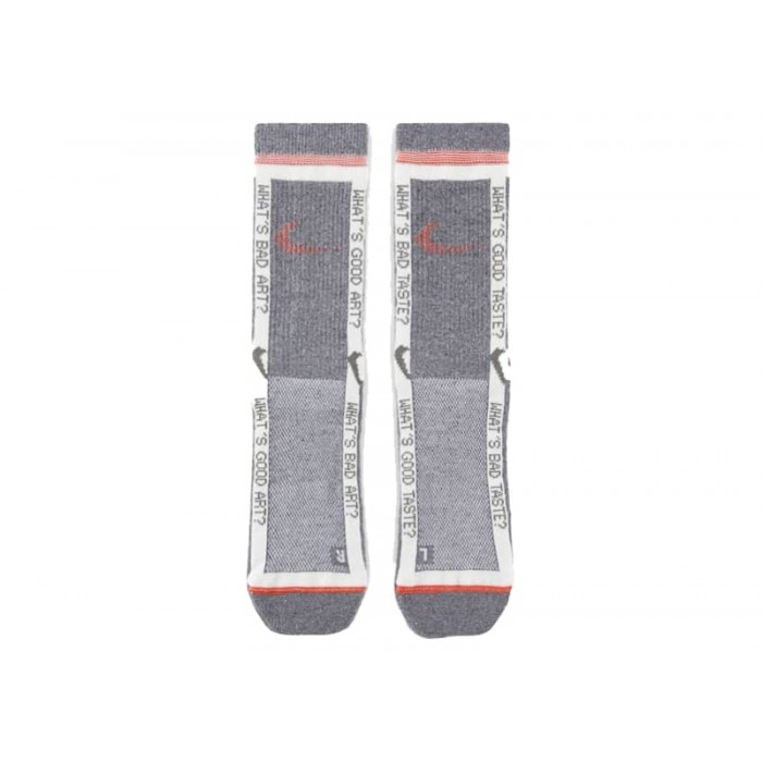 The OFF-WHITE x Nike Socks Grey/Orange is a pair of socks that was designed and released in collaboration by the luxury fashion brand OFF-WHITE and sportswear brand Nike in an orange and grey colorway.This pair of socks seamlessly integrates design and functionality. OFF-WHITE’s industrial aesthetic and striped lines motif runs throughout, even within the Nike Swoosh that presents in an orange-colored striped form. These socks are crew socks, so the length gave the brands some more room to play with. You’ll spot questions embedded into the stitching referencing good and bad art and good and bad taste. Nike Swooshes adorn the ankle area.
