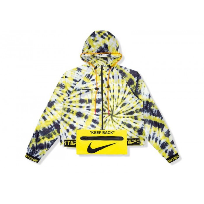 The OFF-WHITE x Nike Women's NRG AOP Jacket Volt is a hooded nylon jacket featuring a zip front rendered in tie-dyed print fabric. Volt's yellow hue blends with shades of black and white. OFF-WHITE and Nike Swoosh branding appears on the cuffs and the included waist pack. Additional OFF-WHITE branding appears on the right chest and as a laser-cut design on the back.The fashion house OFF-WHITE was launched by Virgil Abloh, whose career and designs garnered attention after he interned with Kanye West at Fendi in 2009. OFF-WHITE collaborated with American sportswear giant Nike several times, resulting in fashion-driven athletic wear bearing the hallmarks of Abloh's designs, such as the outward-pointing arrow motif subtly included on the back of the AOP Jacket.