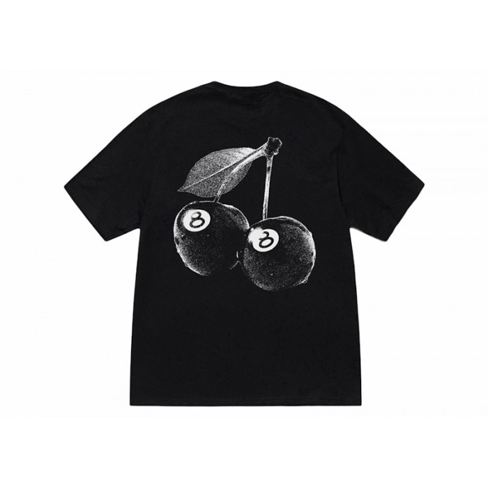 The Stussy Cherries Tee Black is a short sleeve black tee-shirt from California skate/surf brand Stussy that has a cherry graphic featuring eight balls as its main motif.The short-sleeved Black Stussy Cherries Tee debuted as part of Stussy’s 2024 spring/summer release. It has a straight waist hem and straight hemmed short sleeves. On the front upper left chest is a screen printed STUSSY logo in white, while a STUSSY neck tag is at the nape of the round, ribbed collar. The back has a screen print in white of a pair of cherries, and there is an eight juxtaposed on top of each cherry, to make them look like floating magic eight balls or eight balls from a billiards game.