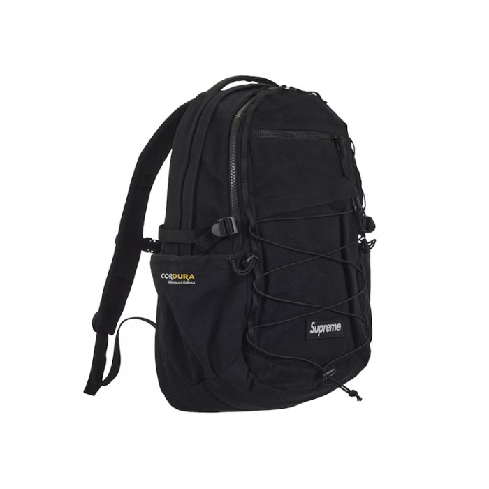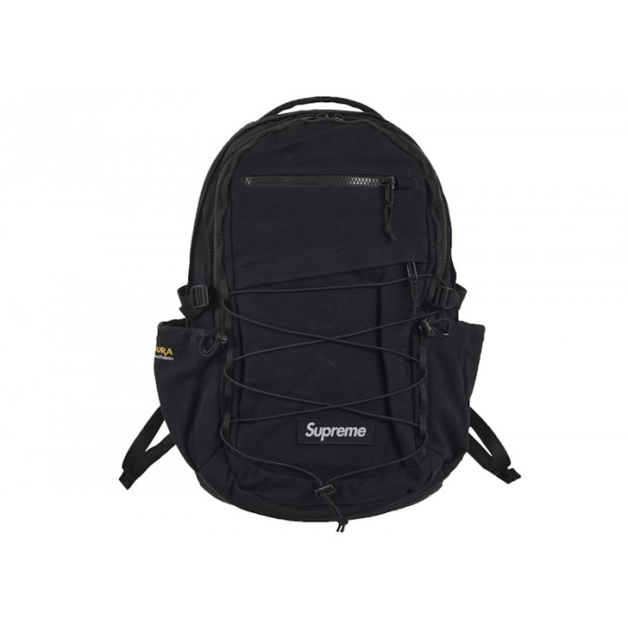 The Supreme Logo Backpack (SS25) Black is a water-resistant and durable backpack with subtle branding elements.This iteration of the Supreme Logo Backpack (SS25) is available in an all-black colorway. It is made of water-resistant Cordura canvas for durability. The main zippered compartment contains a laptop sleeve for the protection of your valuables. The front zippered compartment has an interior mesh pocket. There are also several other smaller compartments, including one with a Velcro closure. There is an elastic shock cord at the front, providing both practicality and a unique style. The back is padded, and the shoulder straps are adjustable for a comfortable fit. The Supreme brand name appears in white on the bottom of the front.