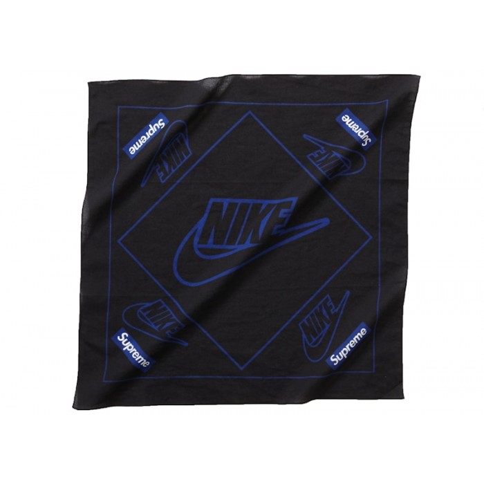 The Supreme Nike Bandana Black is a black woven cotton bandana featuring a printed graphic. The signature Nike text and Swoosh logo are printed in the center in royal blue, outlined by a square on its diamond axis. The Nike text and Swoosh logo in a smaller size are paired with Supreme branding within a royal blue box. This logo pairing frames the center logo and is outlined by another square.New York-based skate gear and streetwear brand Supreme has collaborated with some of the most recognized brands in the world since its 1994 founding. Unsurprisingly, American athletic wear powerhouse Nike saw brand synergy in Supreme, and the Black Bandana is a shout-out to the power and legacy of the two brands’ signature logos.