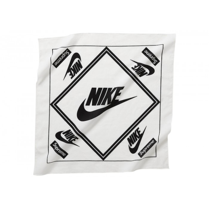 The Supreme Nike Bandana in White showcases a seamless fusion of streetwear aesthetics and sporty functionality.The White Supreme Nike Bandana features Nike's Swoosh logo and Supreme's iconic box logo printed throughout, intermingling both brands' symbols across the entire surface. The white fabric serves as a clean canvas, enhancing the vividness of the black Swoosh and box logos, adding a striking contrast and visual impact. Constructed from premium cotton, the bandana ensures durability and comfort, making it versatile for various styling options. Its square silhouette allows for diverse styling possibilities, whether worn as a head accessory, neck wear, or a statement piece integrated into outfits.