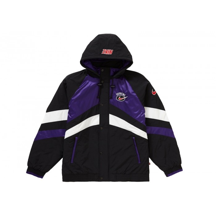 After releasing a collaborative Nike Air Max Tailwind 4 early in their 2019 season, Supreme and Nike have returned for a second release in SS19, this time featuring apparel. Despite being released in May, the collection mostly featured items you'd see in a fall/winter release, including sweaters, hoodies, and sport jackets, all of the vintage looking variety. The water resistant Supreme x Nike Hooded Sport Jacket released in three colorways and feature a quilted inner lining as well as a removable hood. The green, purple, and silver jackets dropped on Thursday, May 23rd, 2019 and retailed at $248 USD.Основные характеристики Supreme Nike Hooded Sport Jacket Purple