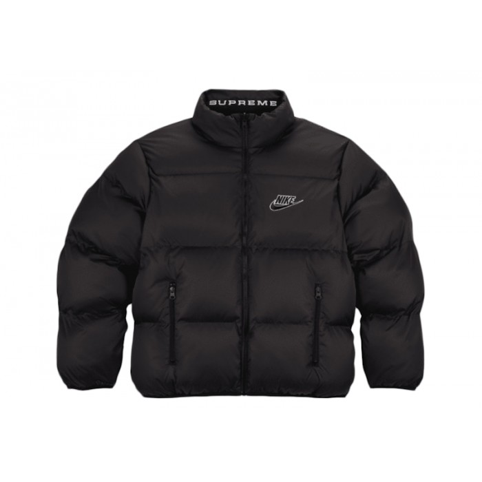 Supreme dropped this Reversible Puffy Jacket in partnership with Nike as a part of their Spring/Summer Week 3 release just one week after dropping their collaborative Dunk Lows.This reversible Supreme Jacket features an all-over Nike print on one side and a snakeskin Nike logo on the other. Both sides of the jacket feature a Supreme logo on the back neck. This Supreme Nike collaboration marked the third straight week that the two brands dropped something together as they restocked their Air Force 1s in Week 1 and released a new Dunk Low in Week 2.