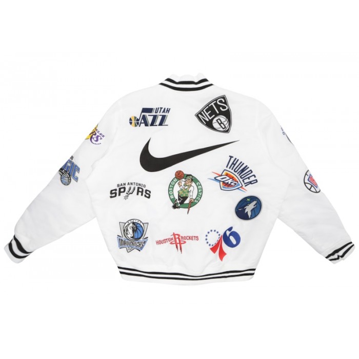 We like the Supreme Nike/NBA Teams Warm-Up Jacket White, which features high-quality denim make-up and cotton lining on the hem, neck, and cuffs. These features help to offer durability and comfort, making it a practical choice for everyday wear. Released on March 8, 2018, this jacket retailed at $328.