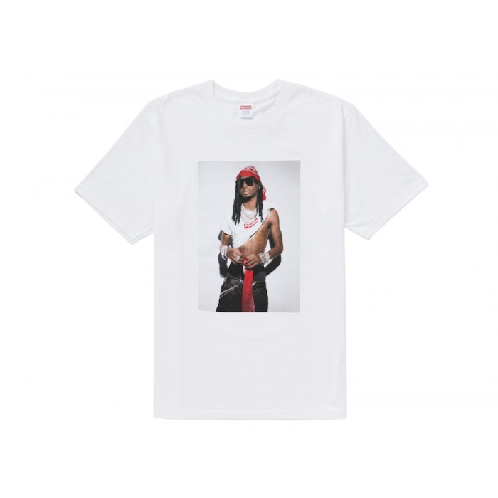 Футболка Supreme Playboi Carti Tee White, выпущенная в рамках коллаборации Supreme и Playboi Carti для коллекции Fall/Winter 2025 (FW25), изготовлена из 100% хлопка и украшена фотографическим принтом артиста на белом фоне.