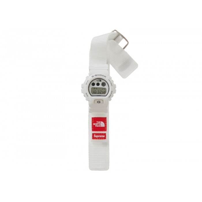 The Supreme The North Face G-SHOCK Watch in white stands as a remarkable triple collaboration among three iconic entities, presenting a triple graph configuration and a double fabric strap embellished with logos from both streetwear brands.With its pristine white resin case and fabric strap, the Supreme The North Face G-SHOCK Watch embodies a blend of ruggedness and sophistication. Boasting features like shock resistance, water resistance, and a digital display, it seamlessly merges practicality with fashion-forward design. Notable accents include The North Face logo gracing the dial and woven Supreme, and The North Face branding on the band.