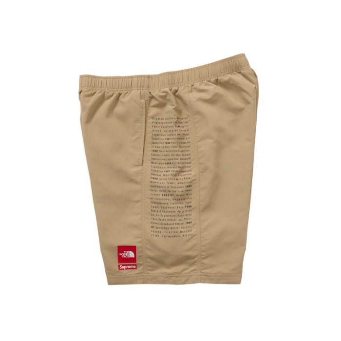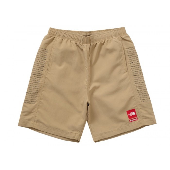 The Supreme The North Face Nylon Short Khaki is a pair of shorts designed as part of a collaboration between the two brands for athletic wear.This version of the Supreme The North Face Nylon Short comes in a dark khaki colorway. The shorts feature a red The North Face logo patch on the bottom corner of the left leg and a red Supreme logo box underneath it. The front also features two pockets. The sides of the shorts contain black text in vertical columns outlining famous outdoor expeditions from around the globe as well as the year of the accomplishment. The back of the shorts is plain except for one zippered pocket. The shorts are made with nylon and a nylon lining for breathability and have a drawstring around the waist for an adjustable fit.