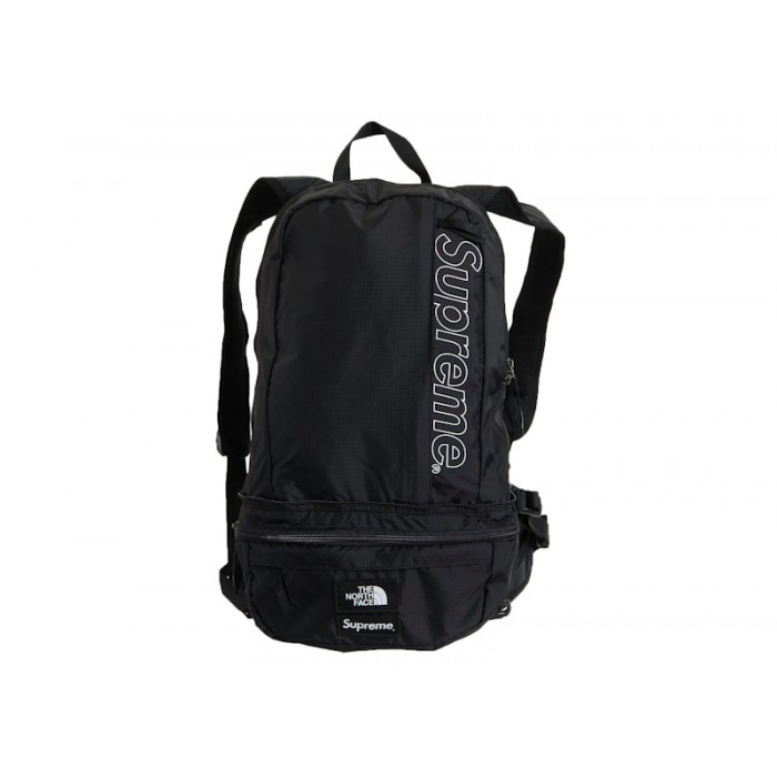 The Supreme X The North Face Trekking Convertible Backpack And Waist Bag Black is part of the Supreme X North Face collaboration bag collection.This black convertible backpack features clip closures at the bottom with adjustable shoulder straps. It also has a regenerated nylon ripstop that is water resistant. The Supreme The North Face Trekking Convertible Backpack And Waist Bag Black has a front zip pocket and a main zip compartment with a mesh internal pocket. The removable waist bag with a large zip-up pocket allows the backpack and straps to be stored on top of the waist bag zip compartment. The Supreme logo is printed in white down the back, and the North Face logo is on the back, at the bottom.